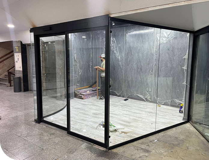 تیم اجرایی در محل پروژه حاضر میشود و عملیات نصب شیشهها، دربها و سایر اجزای داخلی را انجام میدهد